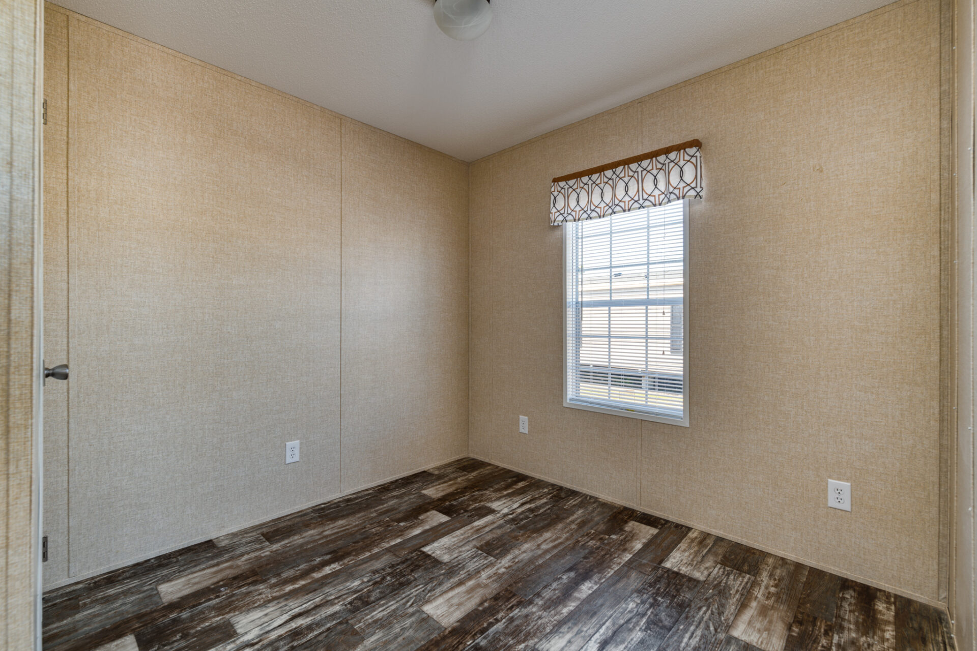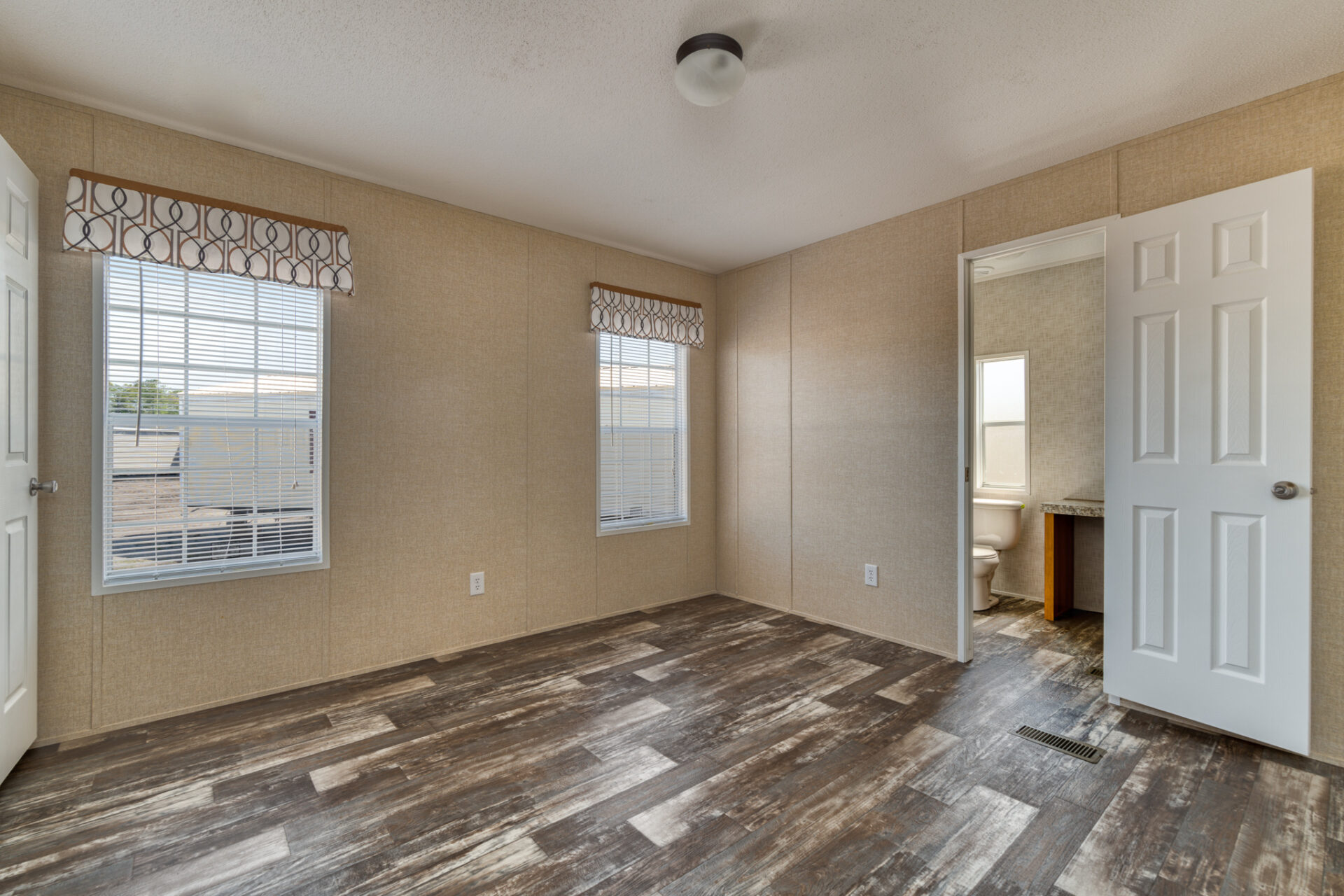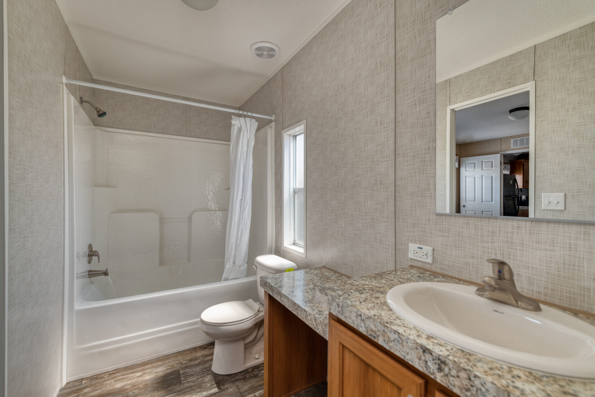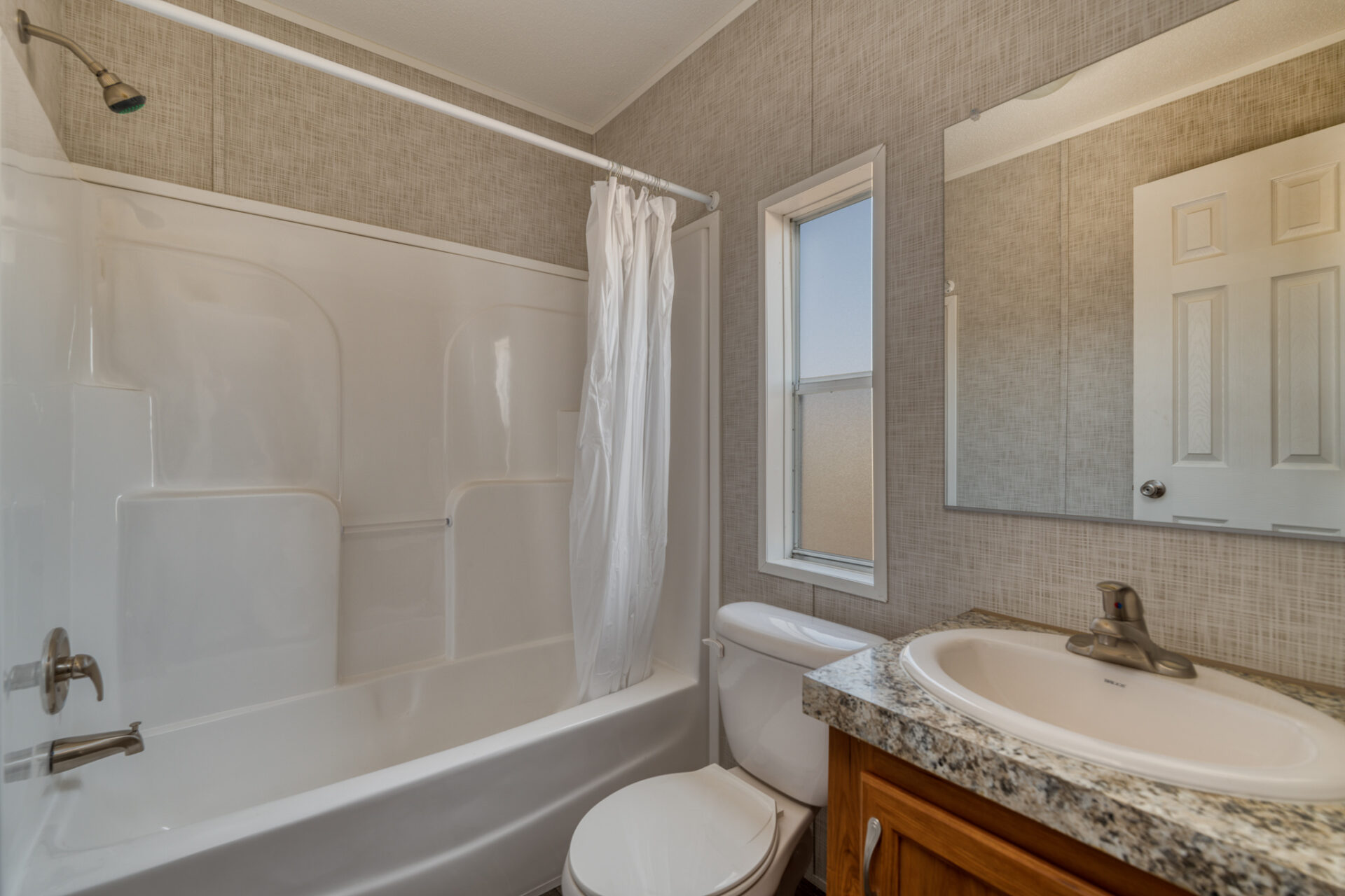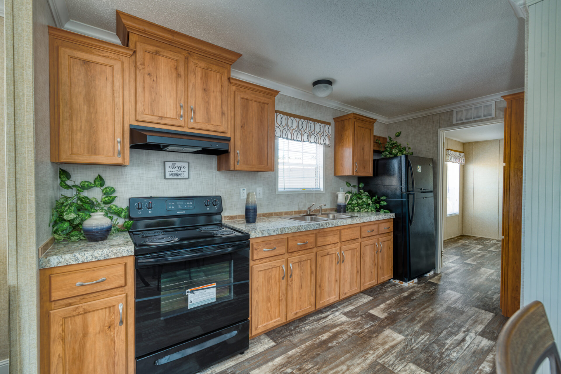 The dining room is lent elegance with its chandelier, and the kitchen sports a 4″ Formica backsplash. It comes with a standard electric range, refrigerator, and a 40-gallon water heater. There’s a 36″ high-base cabinet in the master bathroom and 3″ block-wrapped mirror molding in all bathrooms.