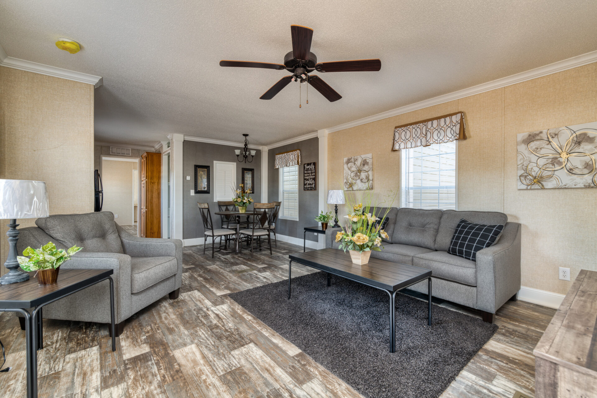 You can customize this beauty with tile to replace the carpet, grand decor cabinets for the kitchen, and an optional master bath package that includes a 54″ Fiberglass shower stall, double lavs with mirrors and vanity lights, and a 60″ tub.