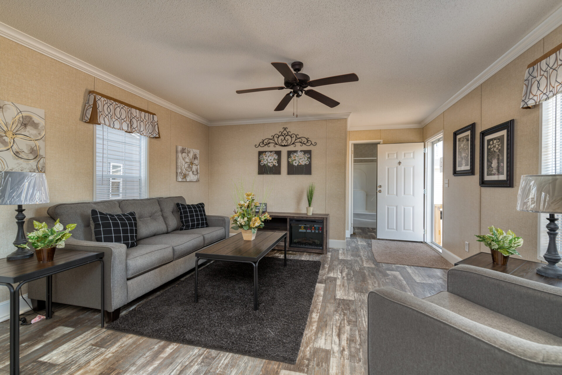8″ alabaster lights illuminate all living areas and bedrooms. There are 4″ block ceiling moldings in all living areas with 2″ block trim molding and 3″ block window molding. There are shutters on the hitch end and front of the home, and 8″ ceilings throughout.